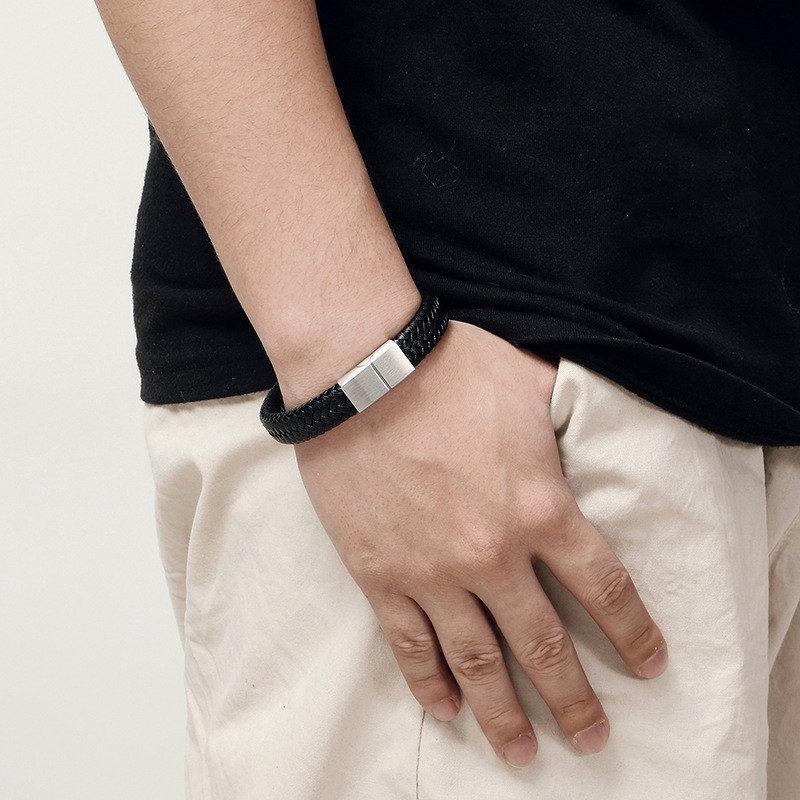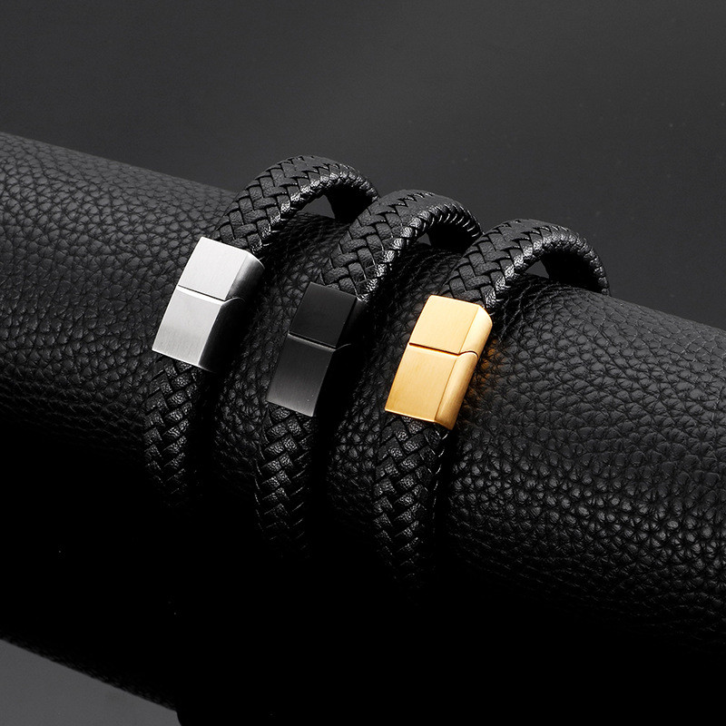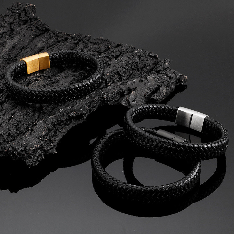 - Simple cowhide woven leather rope stainless steel matte surface magnetic buckle bracelet